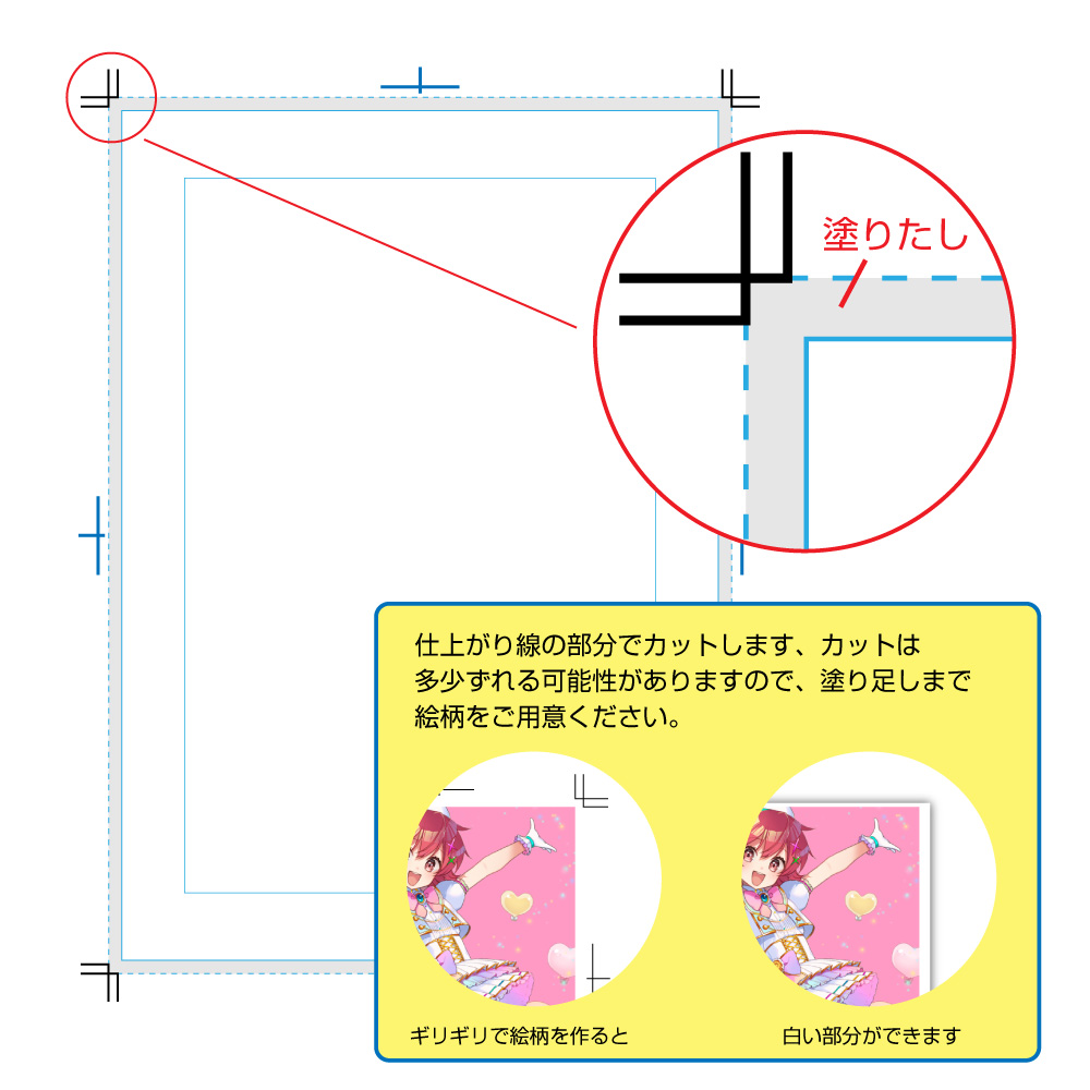 その切り落としの際に生じる多少のズレを目立たなくさせるため、絵柄は塗り足しまで書き込んでください。