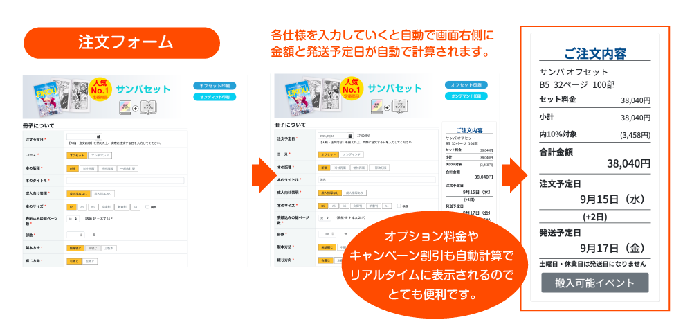 新たに導入される【仮注文フォーム】では、必要情報を入力すると料金と締切が画面右横に自動で算出されます。今まではお客様に手動入力をお願いしていたオプション代も、今後はオプションを選択するだけで画面右横の料金に自動で反映されます。予算内に収まる仕様を確認しながらオプションをお選びください。