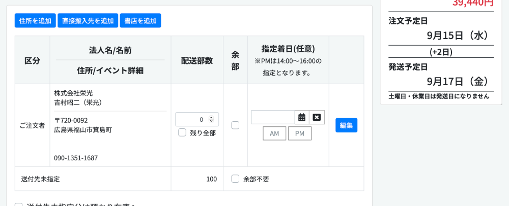 納品先が「書店」のみの場合、余部は「廃棄」しか選べなかった「余部送付先」ですが、新システムからは廃棄の他に「自宅」を選ぶことが出来るようになりました!送料もきちんと自動で加算されます。